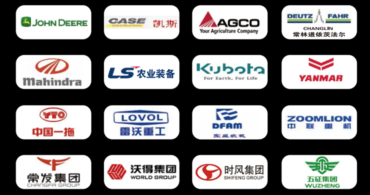 LOVOL, YTO, ZOOMLION, DFAM, CHANGFA GROUP, SHIFENG GROUP, WUZHENG и т. д. в Китае, а также John Deere, Case, New holland, CLAAS, AGCO, DEUTZ FAHR, MAHINDRA, KUBOTA, YANMAR, ISKEI